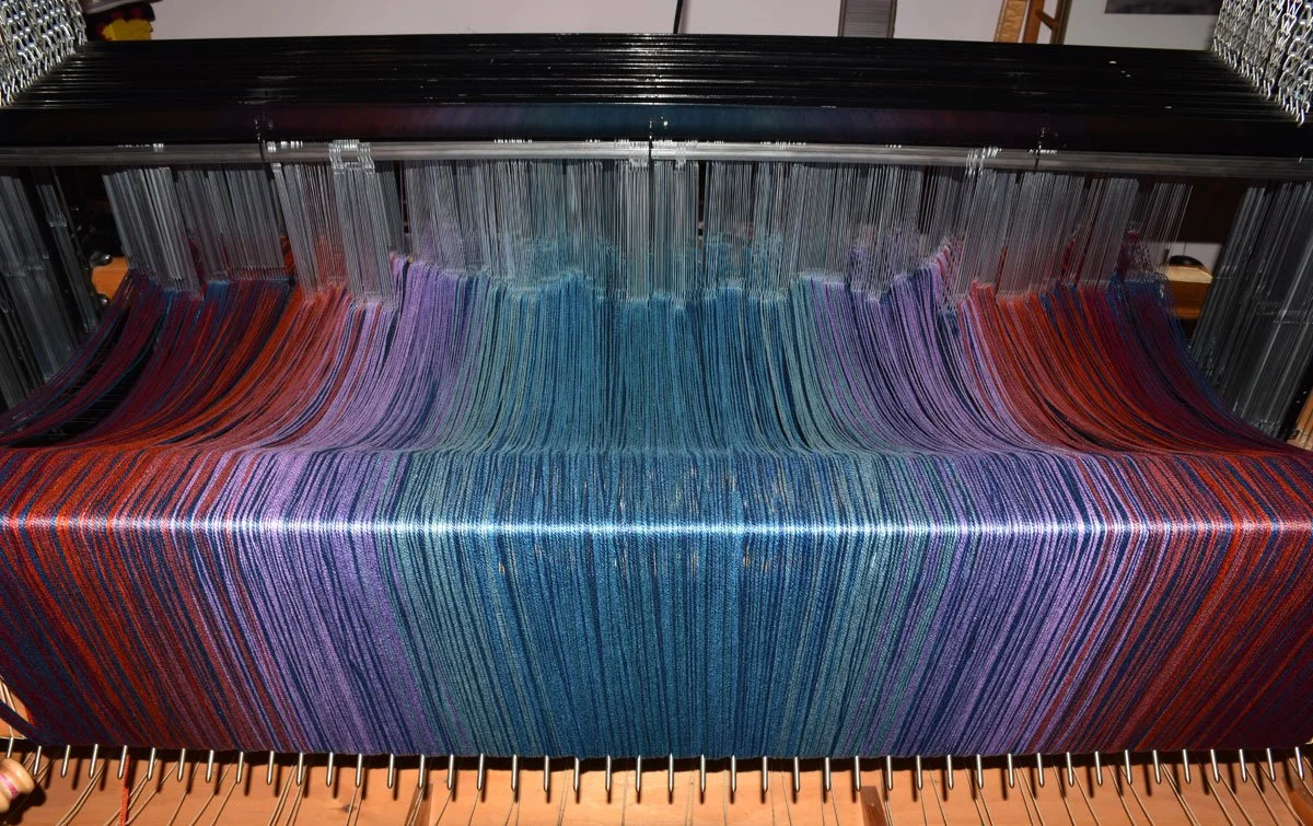 Cobalt Blue, Wine and Garnet colors for the first few inches of the 3/2 cotton warp.