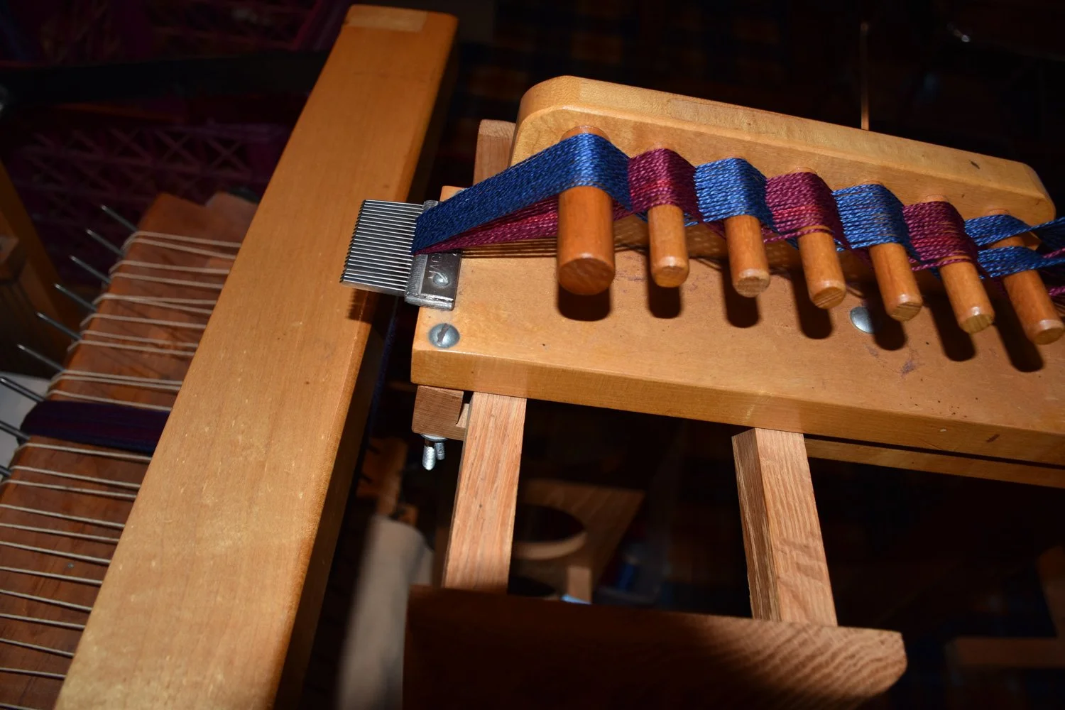 Sectional warping with 30 spools ready to wind onto the warp beam: 15 cobalt blue, and 15 pattern colors with a mix of wine and garnet.